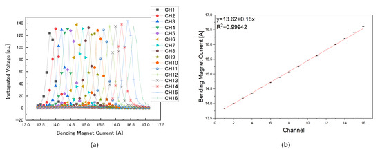 The energy calibration of the SEE monitor was carried out by varying the excitation current of the dipole magnet. Figure 8a illustrates the dependence of the integrated voltage measured by each electrode over the macro-pulse on the excitation current of the dipole magnet. Based on the results, the electrode dependence on the excitation current giving maximum charge is calculated as shown in Figure 8b. According to the relationship between current and channel shown in Figure 8b, the current variation in each electrode was about 1.2%. The linear fitting of the measured data yielded the following relationship between the channel and the excitation current: