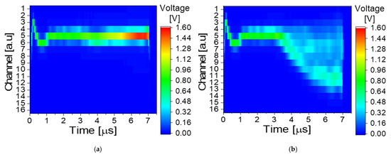 The 2D maps of the single-shot measurement with and without FEL lasing are shown in Figure 9. The signal intensity increased over time, and the average signal intensity was observed to be highest at channel 5 without FEL lasing (Figure 9a). This is due to the electron current increase due to the backbombardment effect in the thermionic RF gun [20]. In addition, the fast transition of the electron beam energy at the beginning of the macro-pulse can be clearly captured. On the other hand, an increase in energy spread and a reduction in the average energy, similar to previous research [11], can be observed when the FEL was lasing (Figure 9b). The time-varying feature of the electron energy distribution can be clearly captured by the SEE monitor.