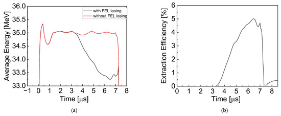 (a) Typical temporal evolution of the average energy in a macro-pulse with/without FEL lasing; (b) Temporal evolution of the extraction efficiency.
