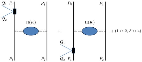 At low temperatures, the product of Fermi–Dirac functions in Equation (1) ensures that neutrinos are thermal, . In this case, the soft bremsstrahlung theorem adapted for weak currents [23,24,25] guarantees that the dominant contribution to emissivity is given by a set of Feynman diagrams plotted in Figure 1, where neutrino emission is coupled to external particle lines. The set of first-order diagrams in Figure 1 corresponds to collisions between different particle species. In the case of indistinguishable particles, there is another set of four diagrams obtained by exchanging the indices of the final states in Figure 1. For long-range electromagnetic collisions, where small values of transferred momentum are important, the direct and exchange diagrams receive dominant contributions from different kinematical domains; therefore, the interference term between them can be omitted [5]. The total emissivity is then just twice the contribution from the diagrams shown in Figure 1.