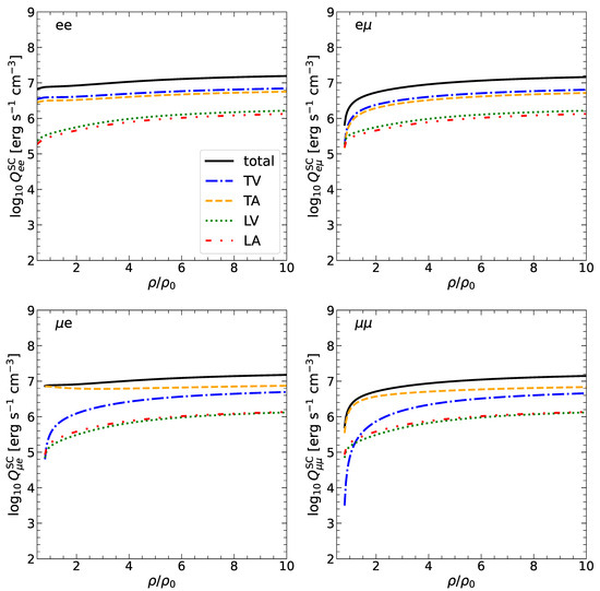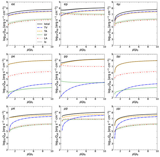 where the four factors , , , and depend on the particle 1 Fermi velocity and the parameter . In Equation (23), we used the fact that ; hence, we approximate in denominators. Since vector and axial-vector channels enter Equation (23) incoherently, the summation over neutrino flavors can be performed. This amounts to replacement of with the total in Equation (23) and subsequent expressions.