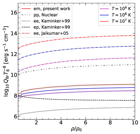 The dynamical character of plasma screening in the transverse channel leads to a peculiar temperature dependence of the corresponding contribution to the bremsstrahlung emissivity. Since enters Equation (37) in the denominator and, according to Equation (38), is very small, being proportional to , the transverse part of the electromagnetic interaction dominates the bremsstrahlung emissivity. To leading order, therefore has a non-standard temperature dependence instead of . Notice that the dominance of the transverse contribution to neutrino-pair electromagnetic bremsstrahlung emissivity was first pointed out by Jaikumar et al. [6]. However, they obtained a much stronger increase in the emissivity in the transverse channel because of the specific selection of the fermion propagator. Due to the lack of a factor in their expressions, the effective collision frequencies were found to be much higher and proportional to instead of here. As a result, neutrino emissivities in the electron–electron bremsstrahlung process in Ref. [6] were found to be comparable to or larger than some of the nucleon bremsstrahlung processes. Here, we obtain much more modest values of the emissivity. We can conclude (see the discussion in Section 3 below) that the calculation of neutrino electromagnetic bremsstrahlung in the absence of nucleon pairing is of academic interest only.