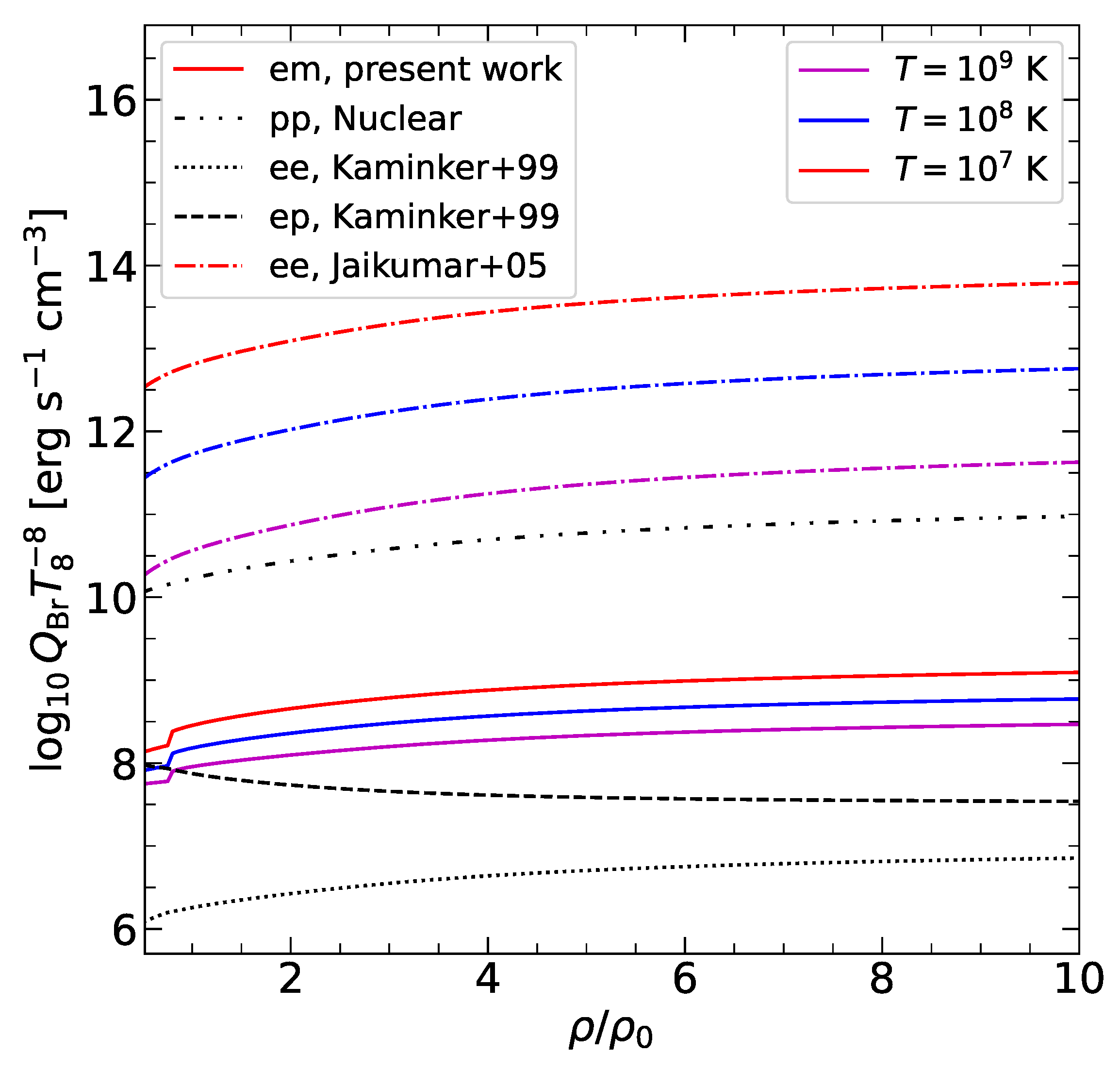 Bremsstrahlung emissivity (scaled by ) due to electromagnetic collisions as a function of density in normal NS cores with BSk24 EoS. Solid red, blue, and magenta lines shows the results of the present study for K, K, and K, respectively. Dash-dotted lines show the results of Ref. [6] for bremsstrahlung for the same three values of temperature, and by dotted lines, the results of Ref. [5] for bremsstrahlung are shown (in this case, combination does not depend on temperature). The black dashed line shows the bremsstrahlung emissivity according to Ref. [5].