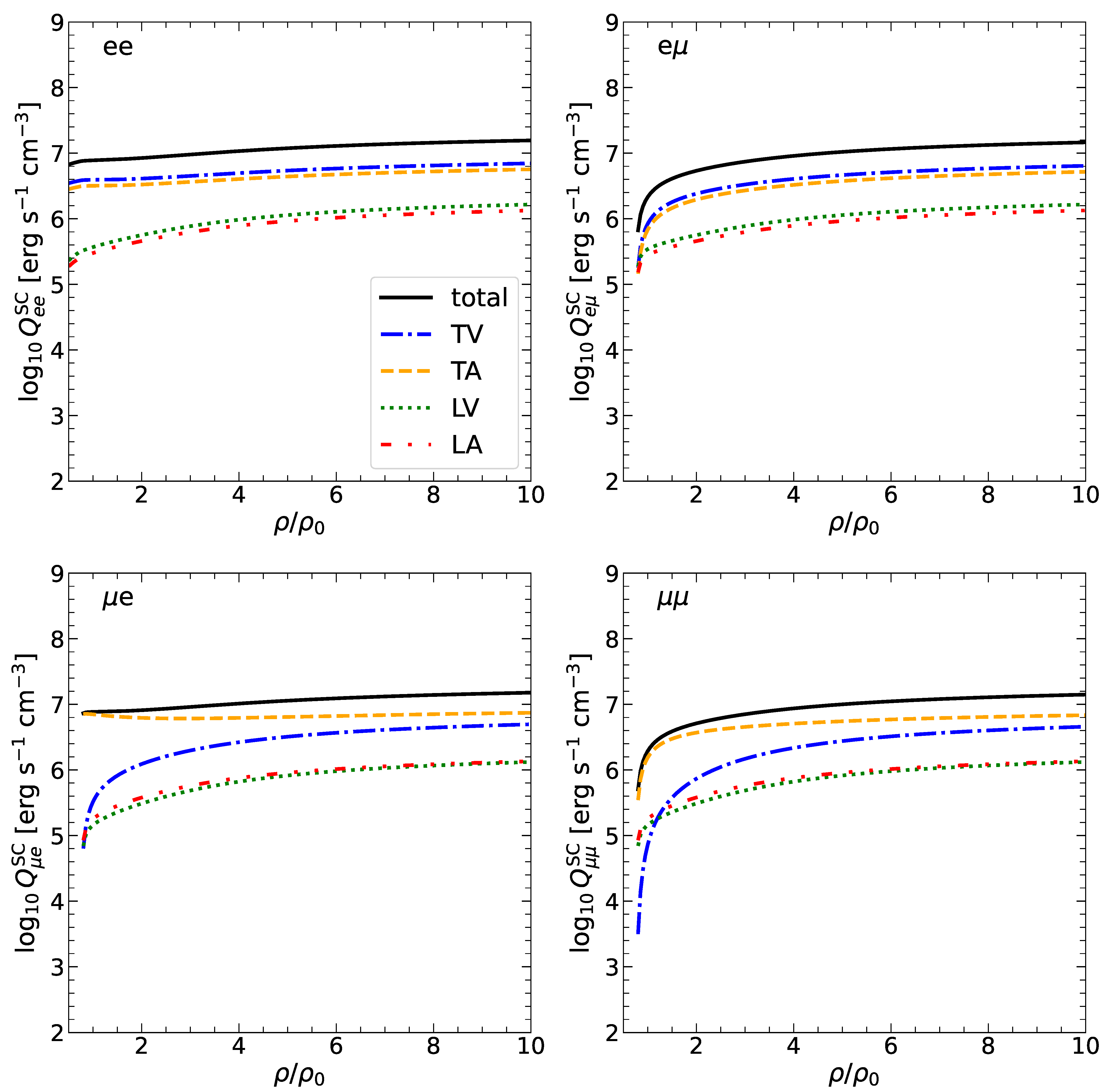 Partial contributions to bremsstrahlung emissivity due to electromagnetic collisions in normal NS cores with BSk 24 EoS as functions of density for K. Each panel marked with corresponds to neutrino-pair emission by particle species i scattered off particle j as indicated in the panels. In each panel, different line types correspond to different contributions to emissivity as shown in the legend and discussed in the text, while total contributions from each collision are shown with black solid lines. Thin lines of corresponding line types show the results of calculations in the lowest-order weak screening approximation.