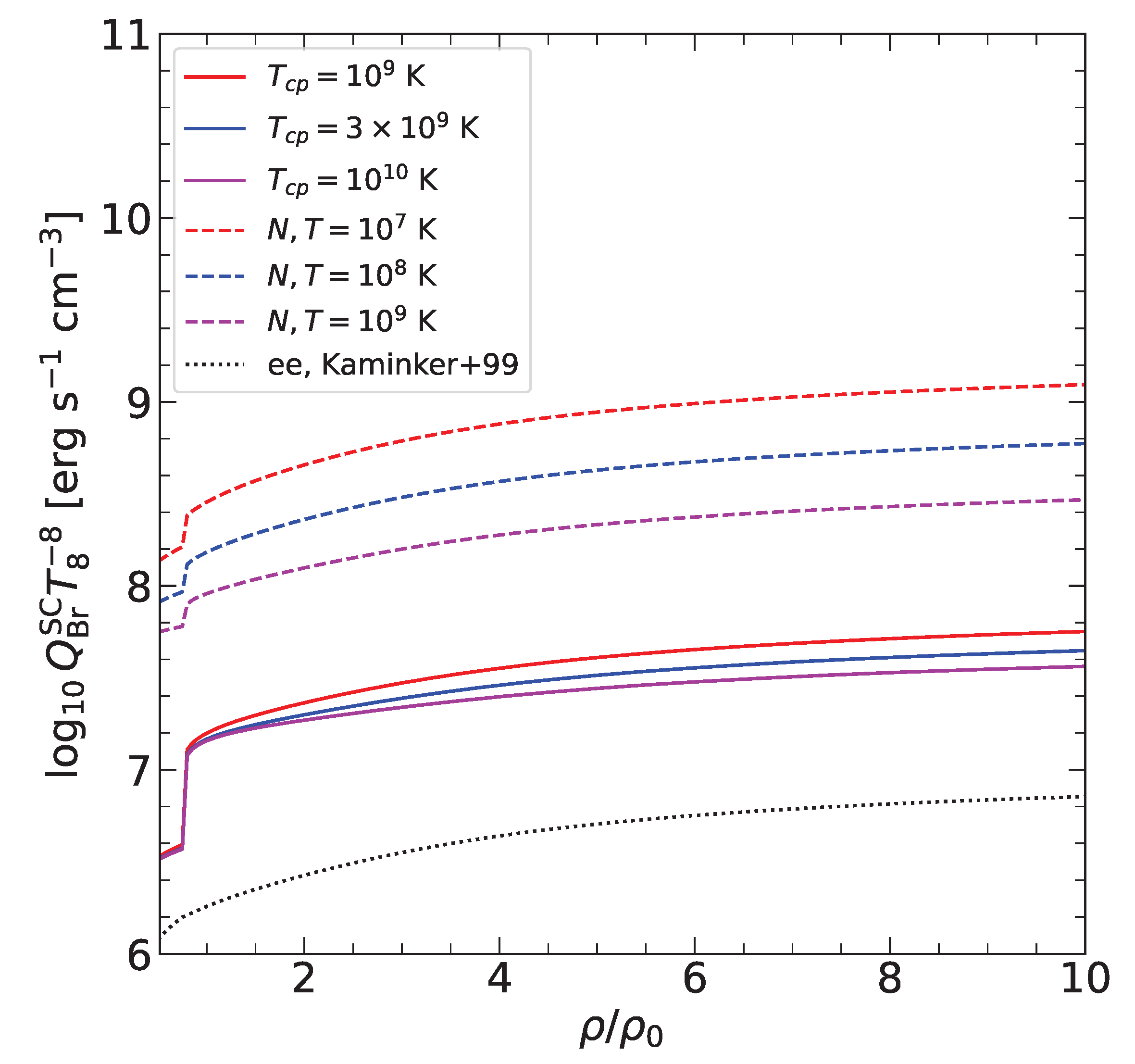 Therefore, the aim of this report is to provide corrected expressions for neutrino emissivity via electromagnetic bremsstrahlung in NS cores. We focus on the nucleonic npe composition of the core, although the generalization to other charged particle species is straightforward. For completeness, we do not rely on either ultrarelativistic or nonrelativistic limits (as in Refs. [5,6]). This allows one to use the obtained expressions to describe processes with the participation of mildly relativistic muons or nonrelativistic protons. We also consider the case of superconducting matter at low temperatures ( with being proton critical temperature) following Ref. [11], where the related problem of transport coefficients in superconducting NS cores was studied. While the transverse channel of electromagnetic interaction is also found to provide the dominant contribution, we show that it is not enough to consider the momentum-independent Meissner screening. That is, in the inner core of an NS, the momentum dependence of the transverse polarization function starts to be important. As a result, a dominant ‘transverse’ contribution to bremsstrahlung emissivity does not depend on at low density and acquires a weak dependence on proton critical temperature at higher densities. We argue that only in the case of the simultaneous presence of strong neutron and proton pairing may the bremsstrahlung processes governed by electromagnetic interaction be important for the neutrino emission budget of the star.