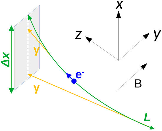 In order to have an estimate of the relevant quantities involved in the charge-sign discrimination technique with EPSI, let us consider the simplified case shown in Figure 2. An electron of energy TeV travels in the x–z plane, perpendicular to the geomagnetic field, which is directed along the y axis and assumed to be uniform with intensity G. Under these assumptions, the helical trajectory reduces to a circular one and we can easily compute the main properties of synchrotron radiation. All of the following quantities are estimated for a 1 TeV electron, but everything can be easily extended to positrons. For this reason, in the remainder of this paper we use the term “electron” to refer interchangeably to an electron or a positron, except where it is explicitly specified.