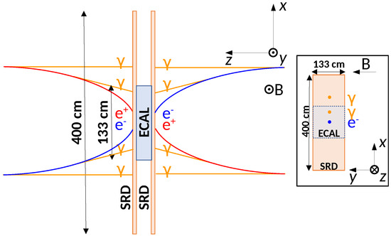 Possible implementation of the EPSI space instrument, with the dimensions not to scale. The trajectories of electrons/positrons arriving from opposite directions, orthogonal to the geomagnetic field, and emitting synchrotron photons are also shown. For more details refer to the text.