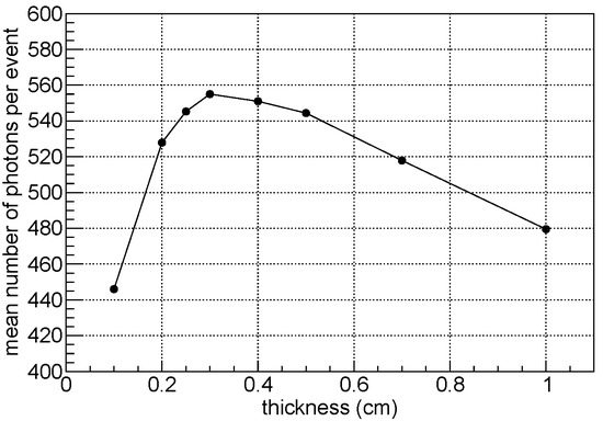 Another key aspect of this study is the size of the detection cell. The area of the detection cell was chosen to be 2 cm × 2 cm, as a compromise between a reasonable number of readout channels for the space instrument and the segmentation needed to identify the charge sign, as described in Section 4.2. Once the choices of crystal, sensor, wrapping material, and cell area size were set, the optimal thickness was studied using optical-ray tracing simulations, as shown in Figure 5. For this purpose, we evaluated how this parameter affects the mean number of collected photons. The result indicates that a thickness of 3 mm maximizes light collection as a compromise between self-absorption losses, dominant for thick crystals, and transmission losses, dominant for thin ones. For the studies reported in this paper, we decided to use 2.5 mm thick crystals, as they were readily available and the light collection is less than a few percent below the optimal value. Finally, again using optical-ray tracing simulations, we noted that light collection drops when increasing the surface roughness of the crystal, motivating the adoption of polished surfaces.