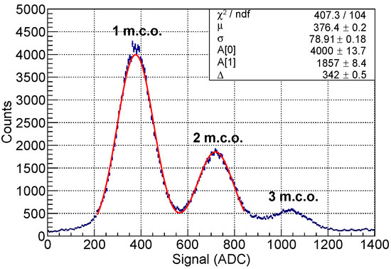 The detector calibration was done with dark-count events acquired in the absence of radioactive sources. After applying the cuts described in Section 6.1, we obtained a distribution as the one shown in Figure 7. Here the signal is expressed in ADC units and can be converted in the equivalent number of m.c.o. by fitting the first two peaks with a double Gaussian function. The fit parameters are the position of the first peak (), the distance between the peaks (), a standard deviation common to both peaks (), and an amplitude parameter for each of them (A). This simplified approach is possible because, given the large gain of the SiPM, the electronic noise dominates over the charge fluctuations and we can assume the same for both peaks. The and parameters were used as the coefficients of the linear calibration equation between the signal expressed in ADC counts, , and in m.c.o. number, , that is: