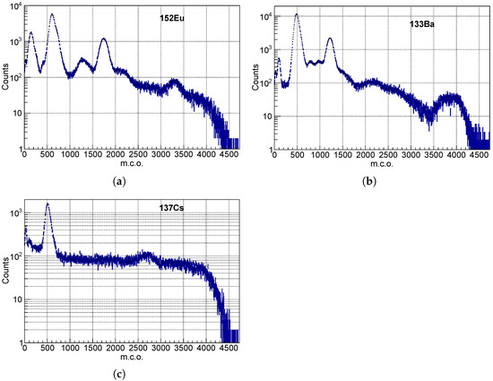 Three radioactive isotope sources were used to test the prototype detector: , , and . The corresponding measured spectra are shown in Figure 8 and their main emission lines are listed in Table 1.
