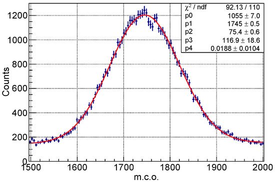 An example of the Gaussian fit to the gamma emission peak around 120 keV of the source. The Gaussian function is overlapped to a linear function to take into account the Compton background. In this case, the Gaussian mean and standard deviation correspond to 1745 and 75 m.c.o., respectively.