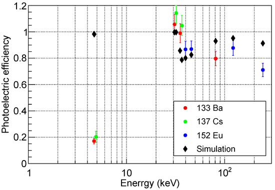 Photoelectric efficiency as a function of the peak energy. Simulation expectations are shown as black points. See text for a detailed definition of this quantity.
