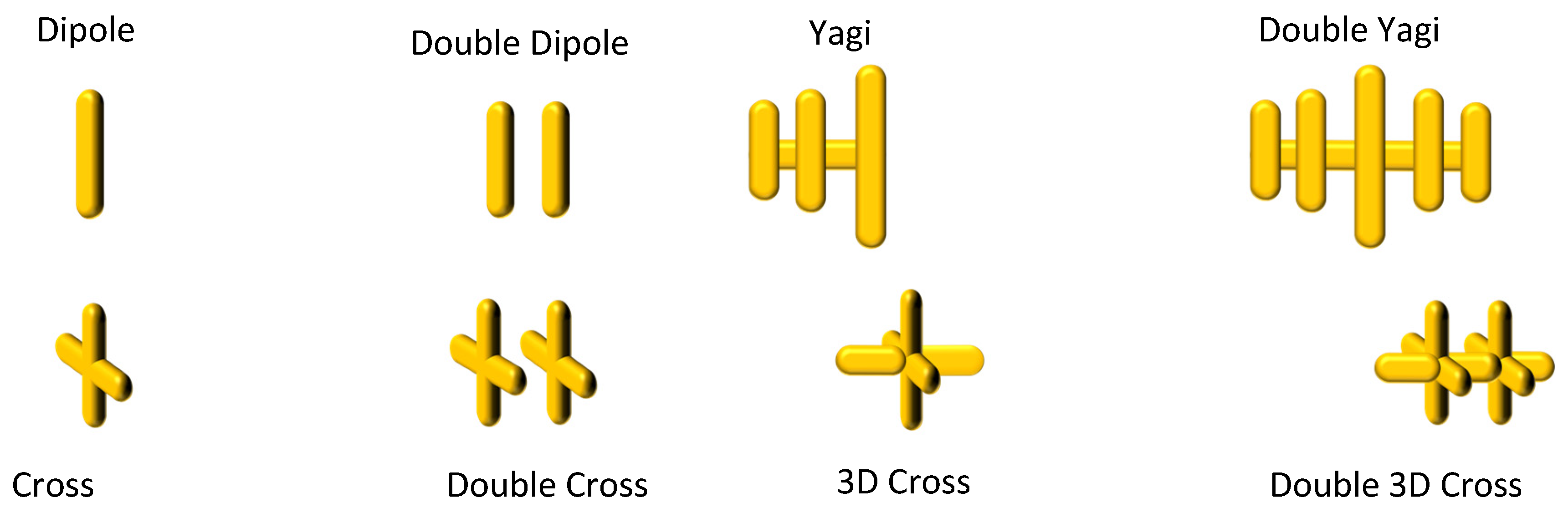 The nanoantenna geometries included single dipoles, crossed dipoles, 3D crosses, double 3D crosses, Yagi-like structures, and coupled 3D configurations (see