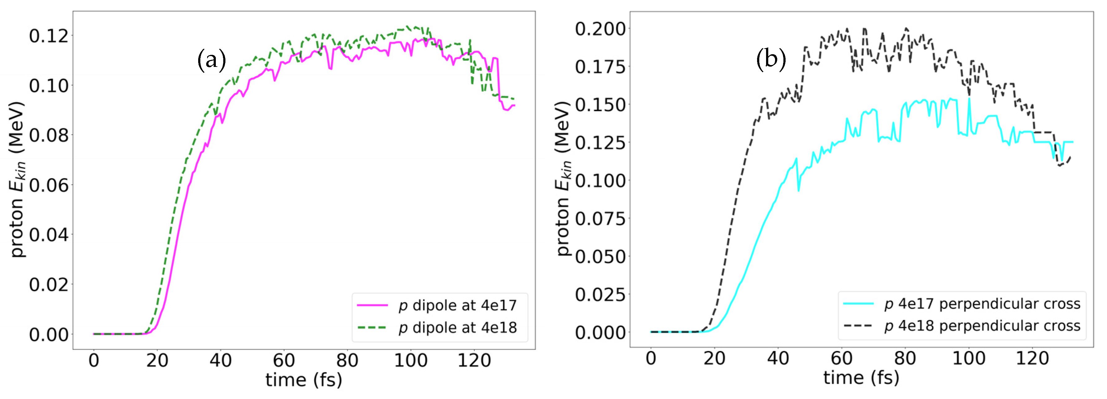 Figure 5. Among various antenna shapes the close paired 3D cross yields the highest proton energies. The enhancement is not only in energy magnitude but also in proton population: simulations show 20–30% more protons achieving energies above 0.2 MeV compared to single dipoles. The energy distributions exhibit notable anisotropy: while dipoles concentrate protons along the laser polarization axis, crossed and 3D structures produce broader angular spreads, which may be advantageous for applications requiring uniform irradiation. Saturation effects are less pronounced for these geometries, as the coupled plasmonic modes allow sequential acceleration events and mitigate early electron depletion.