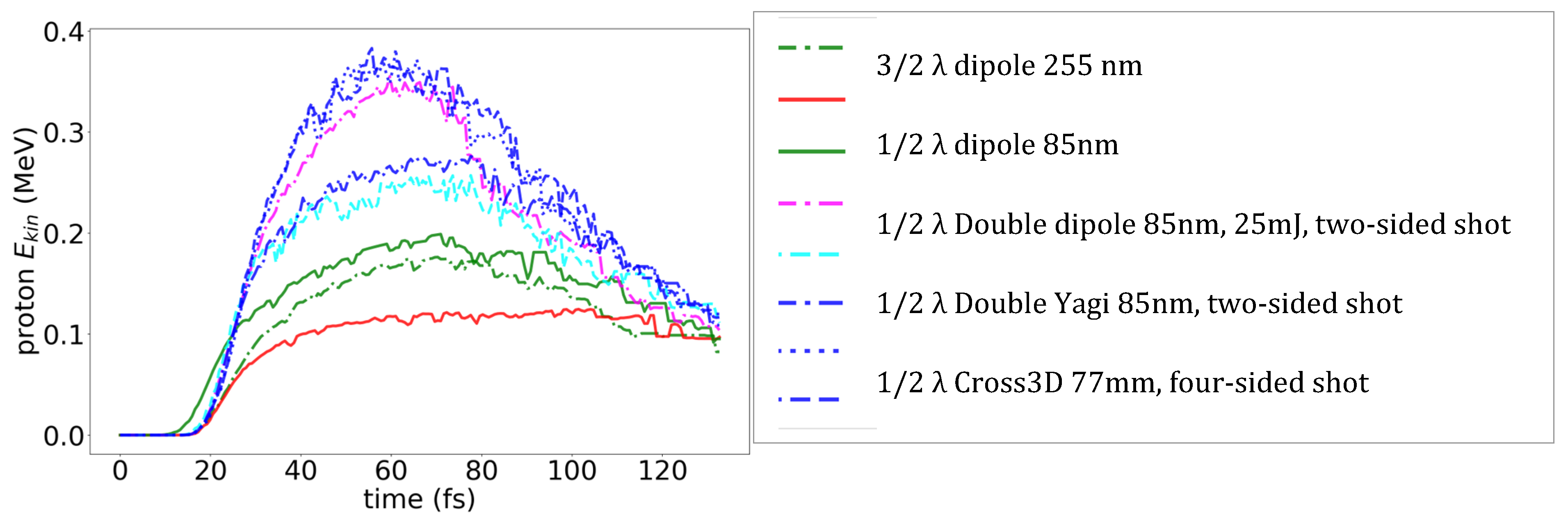 Advanced 3D geometries: Double 3D crosses and Yagi-like antennas reach proton energies of 0.4 MeV at 4 × 1018 W/cm2, producing both higher energy and increased proton populations. Optimized inter-antenna spacing (~40 nm) maximizes collective field enhancement.