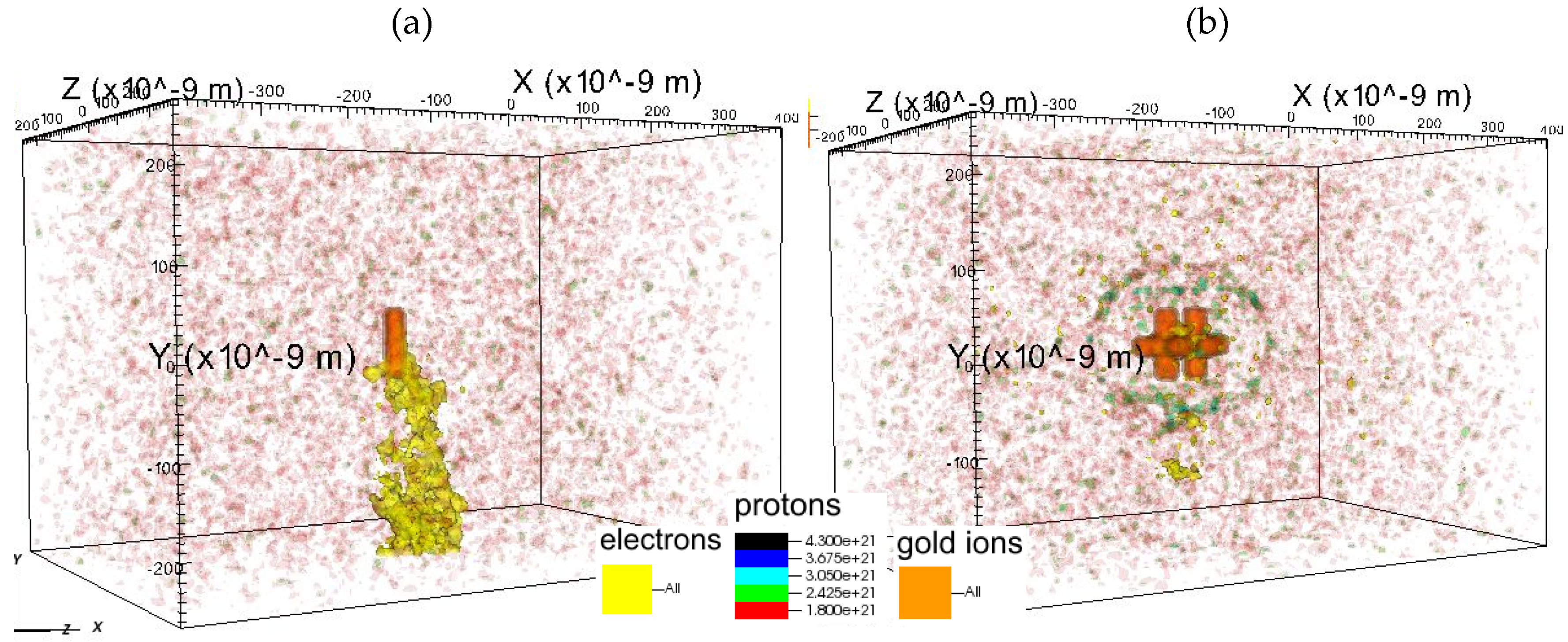 19]. The simulation grid in EPOCH covered dense media with spatial and temporal resolutions sufficient to resolve plasmonic oscillations and electron dynamics (~0.6 fs per frame). The simulation volume measured 795 × 530 × 530 nm