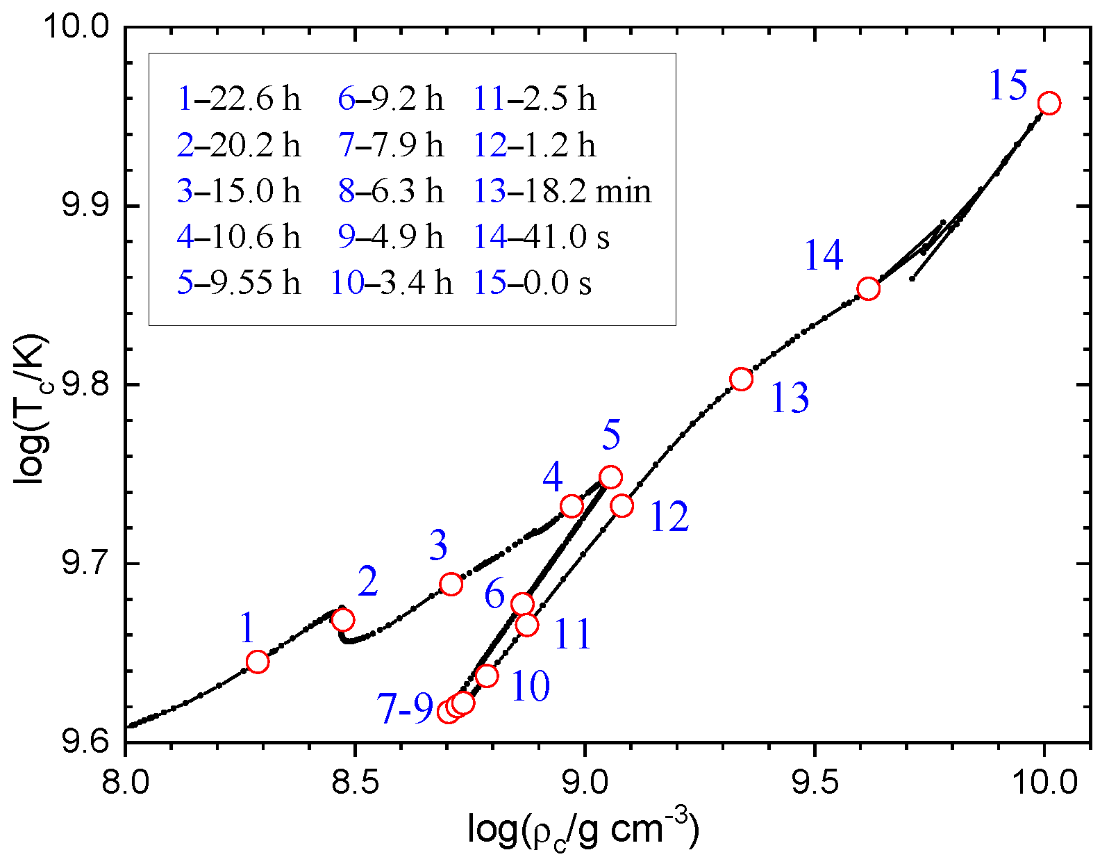 - Paxton, B.; Schwab, J.; Bauer, E.B.; Bildsten, L.; Blinnikov, S.; Duffell, P.; Farmer, R.; Goldberg, J.A.; Marchant, P.; Sorokina, E.; et al. Modules for Experiments in Stellar Astrophysics (MESA): Convective Boundaries, Element Diffusion, and Massive Star Explosions. Astrophys. J. Suppl. Ser. 2018, 234, 34. [Google Scholar] [CrossRef]