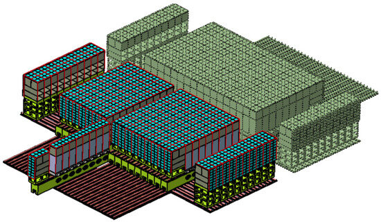 Exploded view of the large telescope array configuration (MoonRay-256) with 16 × 16 towers (3.2 m × 3.2 m × 1 m). Lateral walls are shown only along two sides.