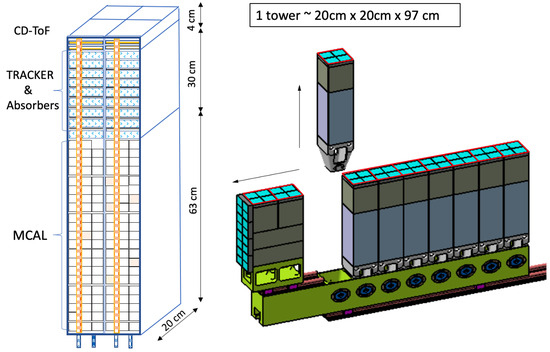 “Lateral walls” extend the coverage to the four lateral sides. This is achieved with horizontal modules that are very similar in design to the upper part of a tower (Figure 2). In fact they implement only the CD-ToF and Tracker sub-systems, but not the calorimeter, whose functionality is already provided, at all incident angles, by the “core” of the telescope. The horizontal modules are equipped with a longer tracker, obtained by increasing the number of silicon strip detector (SSD) layers. Hermetic coverage of the intermediate angles is provided by “short towers”, equipped with extra CD-ToF layers. With this geometry, charge measurement and backscattering rejection is extended to all sides of the telescope, increasing the coverage of gamma-ray detection to angles a few degrees above the horizon.