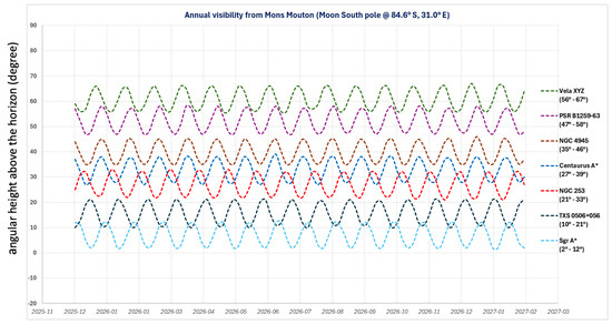 Annual visibility of seven sources from a candidate site possibly located at Mount Mouton, close to the Moon South Pole, at 84.6° S latitude, 130.0° E longitude. The Galactic Center is somewhat low above the horizon; however, SgrA* remains visible all along the year, reaching a maximum at 12°.