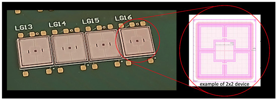 An example of 2 × 2 LGAD pixels as implemented in the LGAD prototype tested at CERN in November 2024 with a fragmented Pb beam.