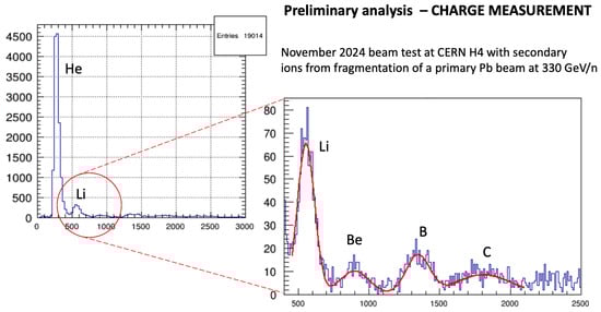 During a recent campaign at CERN (November 2024) with a beam of fragmented Pb ions, five layers of 3 mm × 3 mm LGAD pixels, with either 150 or 275 m thickness, (see Figure 4) were interfaced with large dynamic range front-end electronics based on the VA32HDR14 chip, digitized, and read out. Each layer hosted 16 LGAD devices with 2 × 2 pixels each, with several configurations of guard-ring geometry and inter-pixel distance. Preliminary results on the charge resolution obtained at the beam test are shown in Figure 5 where the charge resolution for helium is better than 0.1 charge units.