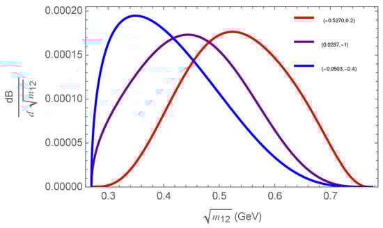 When the relations (38)–(40) are applied, the Equation (112) depend exclusively on . Assuming that the theoretical prediction matches the experimental branching ratio, one obtains a quadratic expression in . Using the constraints (43), we find the roots . Similarly, applying the constraints (46) yields the solutions .