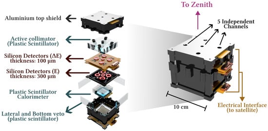 Exploded view of the LEM detector. From top to bottom: Aluminum top shield; active collimator made of a 1 cm thick, hole-drilled plastic scintillator for vetoing off-axis particles; first silicon detector layer () with five 100 µm thick surface-barrier detectors; second silicon detector layer (E) with five 300 µm thick PIPS detectors; 2 cm thick plastic scintillator calorimeter; and the lateral and bottom veto system formed by additional plastic scintillator plates. The fully assembled detector is a compact cube, hosting five independent channels pointing towards the zenith. The lower section contains the electrical interface (to the satellite), providing the connection to the spacecraft bus. The combination of active collimation, silicon telescopes, and scintillator calorimetry enables event-by-event identification of electrons down to 0.1 MeV and protons down to 3 MeV.