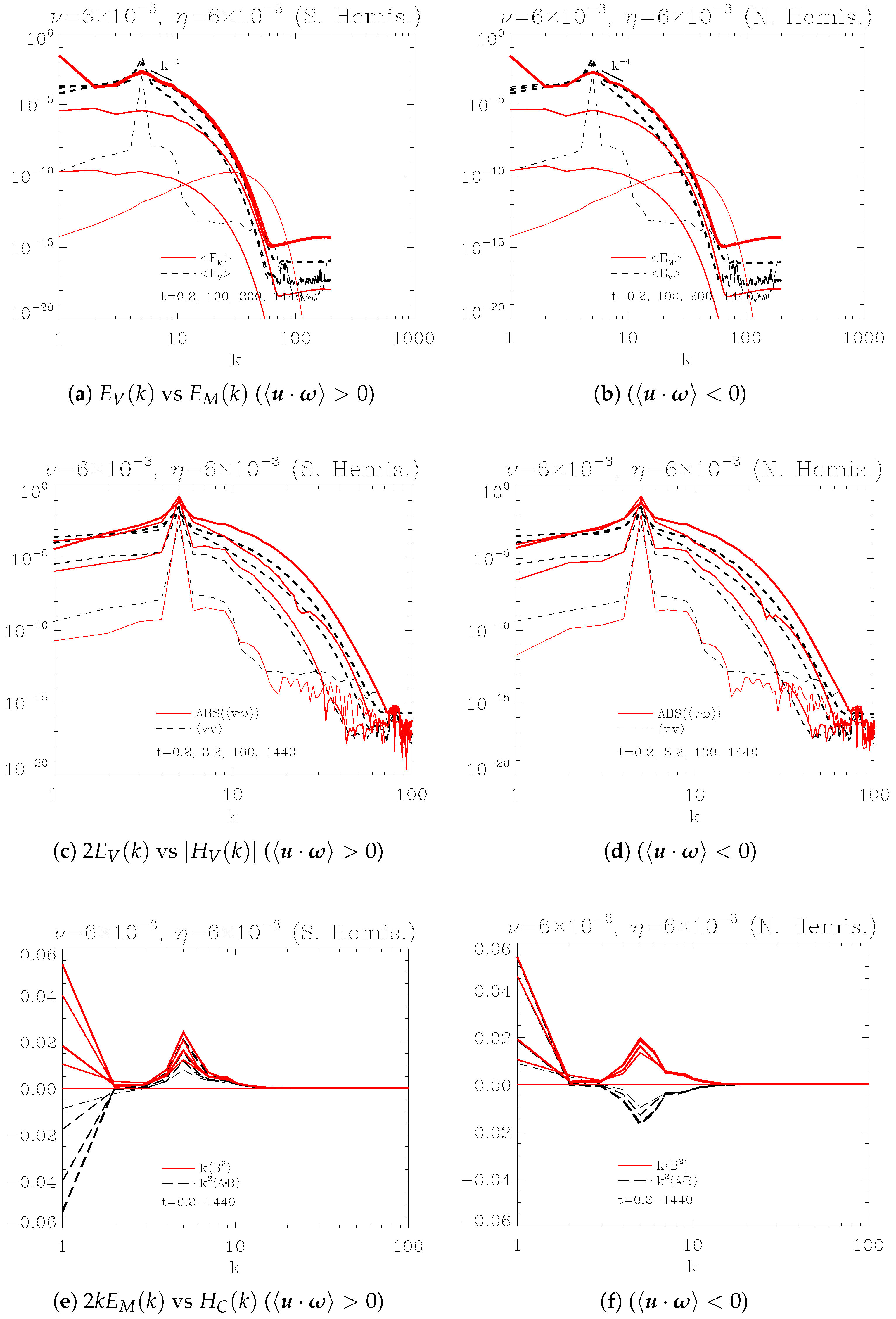 Figure 1a,b depict the magnetic energy spectrum (red solid line) and kinetic energy spectrum (black dashed line) in Fourier space at times and 1440. As observed, the energy spectra for the southern and northern hemispheres match precisely. Both panels illustrate that the kinetic energy at the forcing scale is converted into magnetic energy , which is subsequently inverse cascaded to the large scale . At this scale, is significantly low, indicating an insufficient inverse cascade of kinetic energy. Additionally, each energy spectrum decreases more steeply than the Kolmogorov scale , implying that the kinetic energy from the forcing scale does not fully cascade down to smaller plasma eddy regions, a limitation arising from the low magnetic Reynolds number .