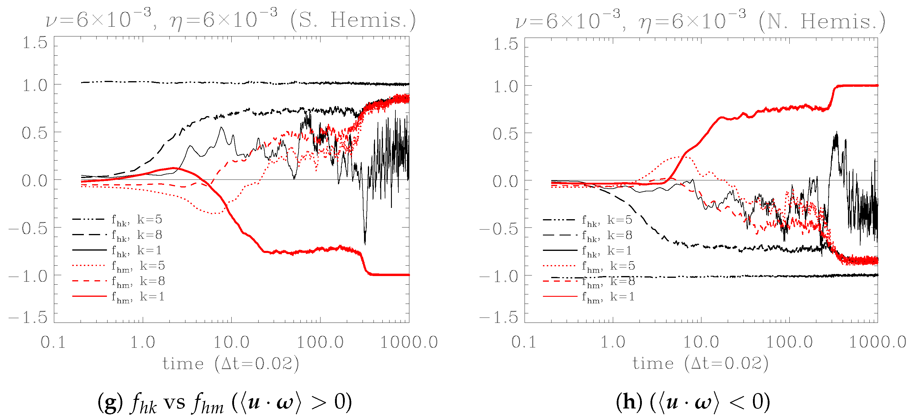 Figure 1g,h display the kinetic helicity ratio (black) and the magnetic helicity ratio (red) for . In the Southern Hemisphere, at the forcing scale, where , is , and in other regions maintains somewhat positive values. On the other hand, converges to when , with values in other small-scale regions converging to positive values. The opposite phenomenon occurs in the Northern Hemisphere, as shown in the right panel. The raw data in Figure 1a–f are used to compute and , and s in Figure 1g,h are employed to reproduce with the and coefficients.