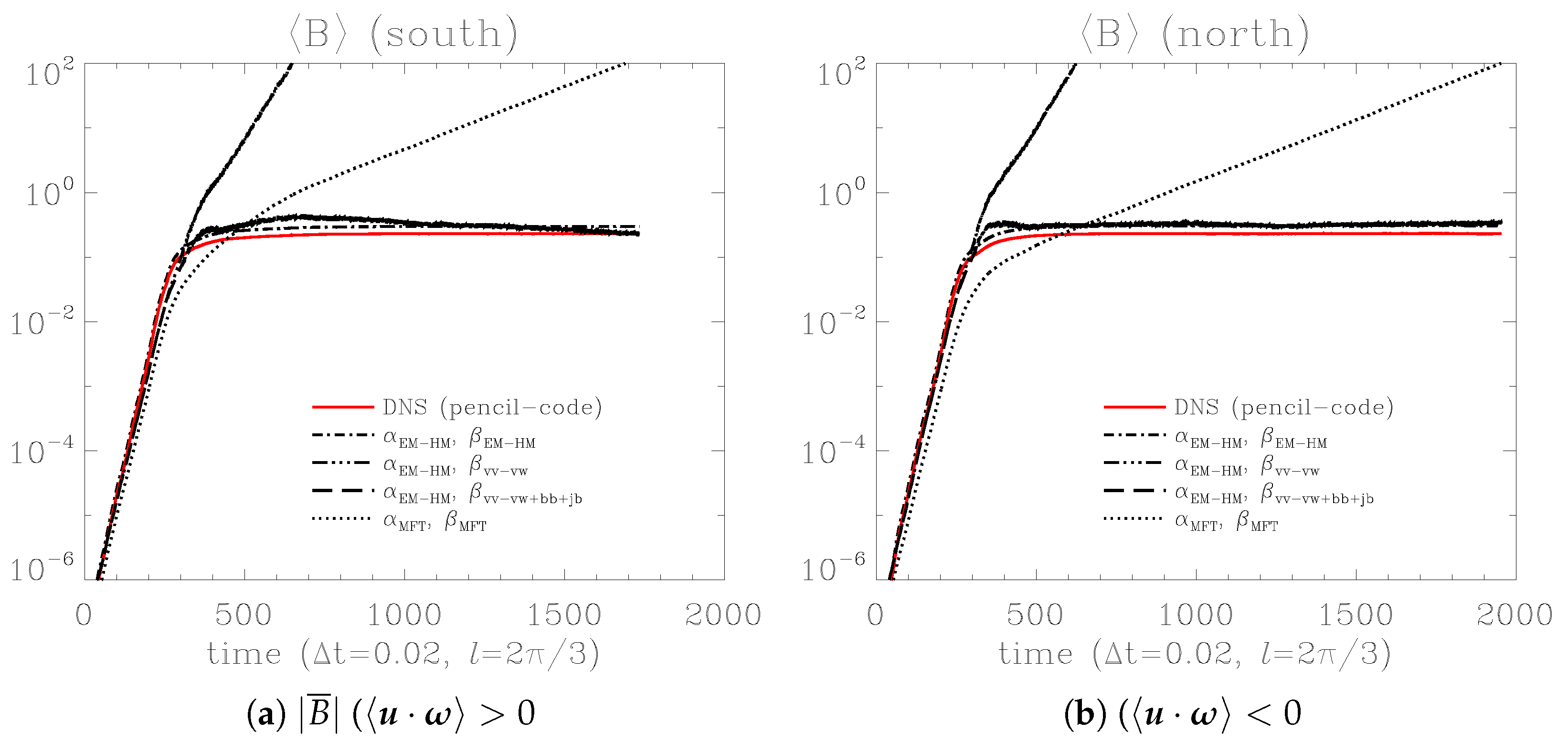 The sign in front of is positive (‘+’) for the Northern Hemisphere (left-handed kinetic helicity, Figure 1f,h, ) and negative (‘−’) for the Southern Hemisphere (right-handed kinetic helicity, Figure 1e,g, ). Among the configurations, ( & ) yields the most accurate results, while the classical MFT method shows the lowest accuracy. This trend is consistent with the results observed in Figure 4. Meanwhile, ( & ) provides relatively accurate results in the kinematic regime. However, as the magnetic field grows, deviates larger than the actual value. This unconstrained growth implies the existence of additional mechanisms that quench the effect.