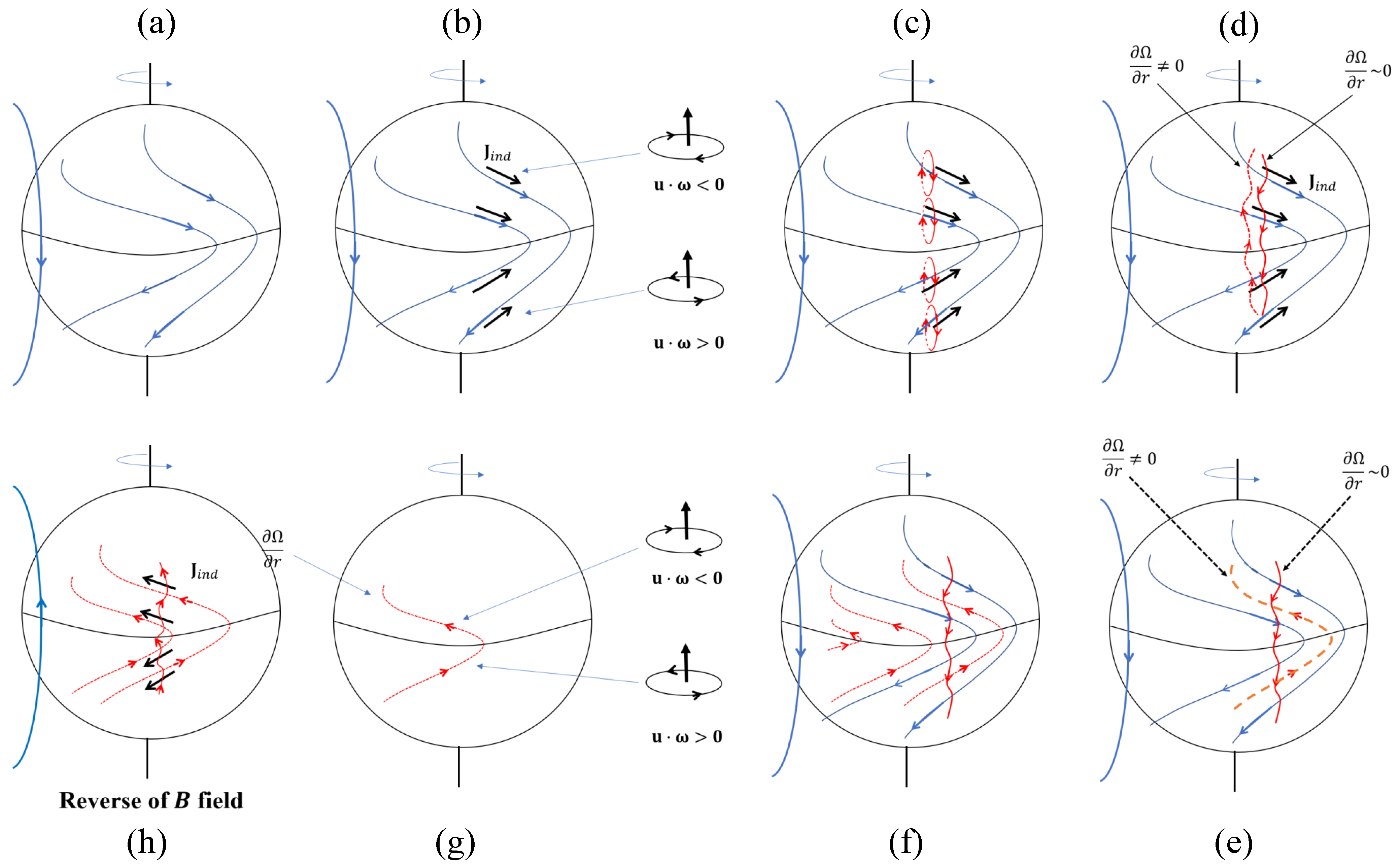 As Figure A1b shows, in the northern hemisphere, induced by left-handed kinetic helicity is in the same direction as the magnetic flux. On the contrary, is induced in the opposite direction in the southern hemisphere. Due to the opposite direction of in both hemispheres, the current densities in the northern and southern hemispheres flow from west to east. We will discuss the generation of aligned with due to kinetic helicity.
