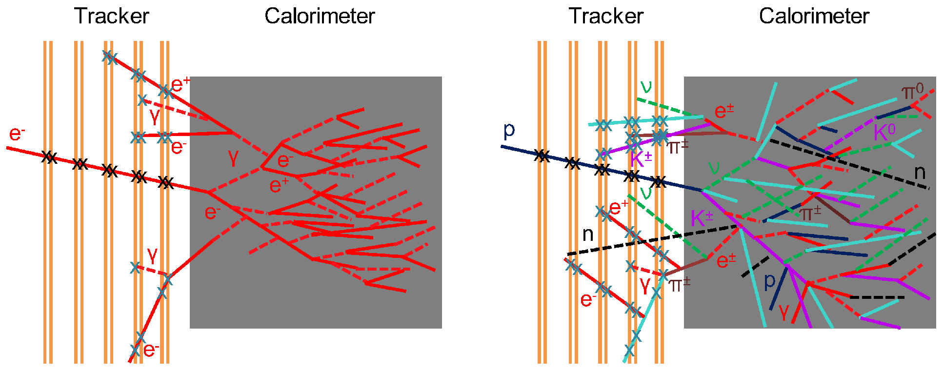 Representation of secondary particle tracks in a tracking detector positioned upstream of a calorimeter. Primary electrons (left) induce an electromagnetic shower within the calorimeter, producing primarily ultra-relativistic and backscattered secondaries detectable in the upstream tracking layers. In contrast, primary protons and nuclei (right) initiate a hadronic shower (schematically illustrated here for clarity) inside the calorimeter, which can generate a population of slower backscattered secondary particles detectable by the upstream tracker [12].