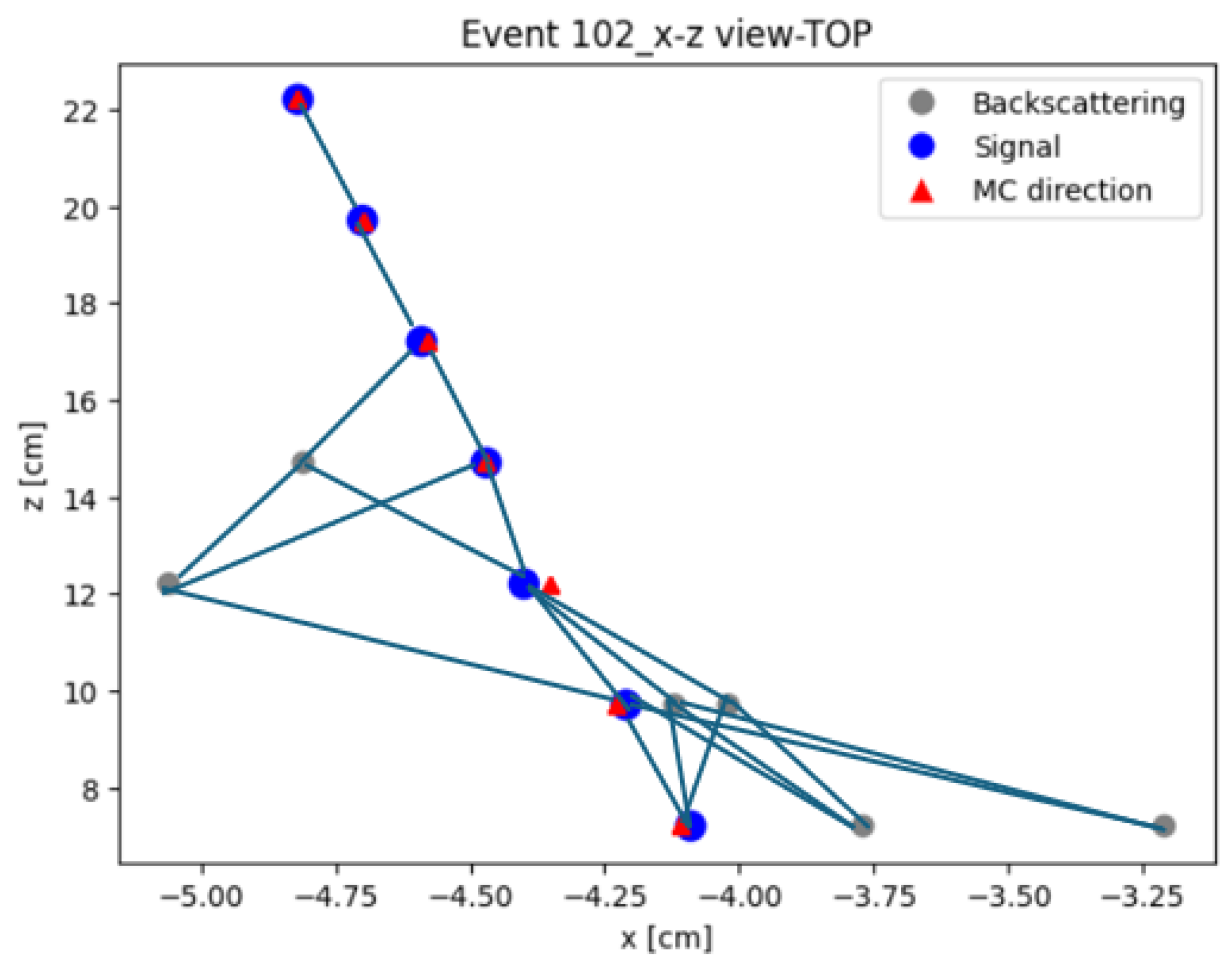 An example of track data represented as a graph. The grey dots represent the backscattering clusters (class 0), the blue ones represent the signal clusters (class 1), and the red triangles represent the primary track direction.