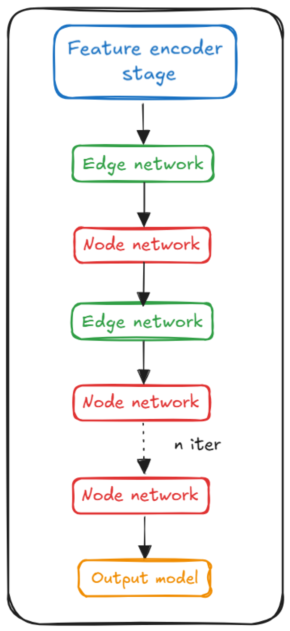 The node and edge network are applied recursively for a fixed number of iterations N. At each iteration i, edge weights are recomputed by the edge network, and node features are updated by the node network using the aggregated information from neighboring nodes. After a fixed number of iterations, the final node representations are passed to the output module, which consists of a linear classifier with dropout regularization. This module outputs classification scores for each node, identifying whether it belongs to the primary track or to a backscattered track.