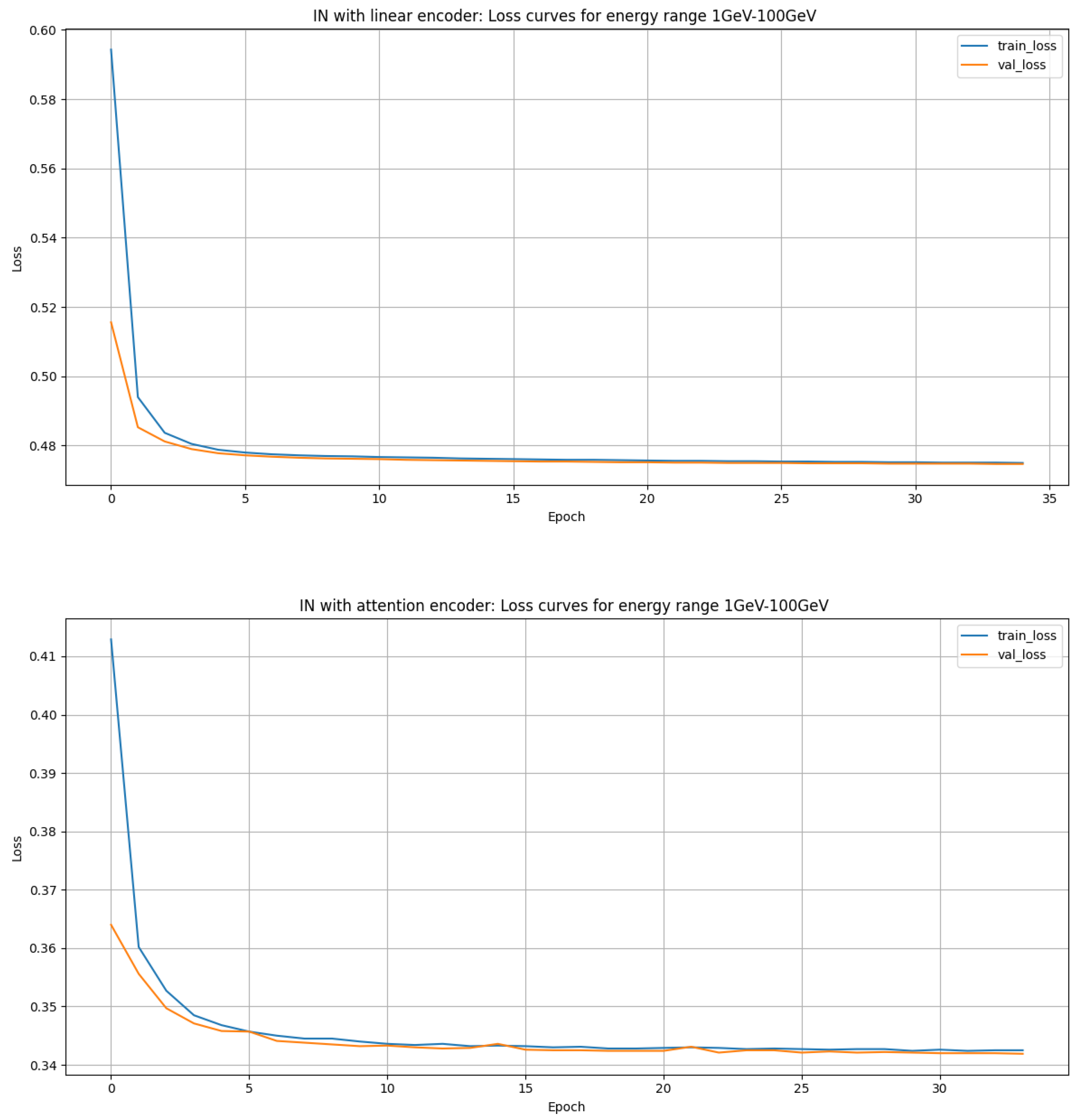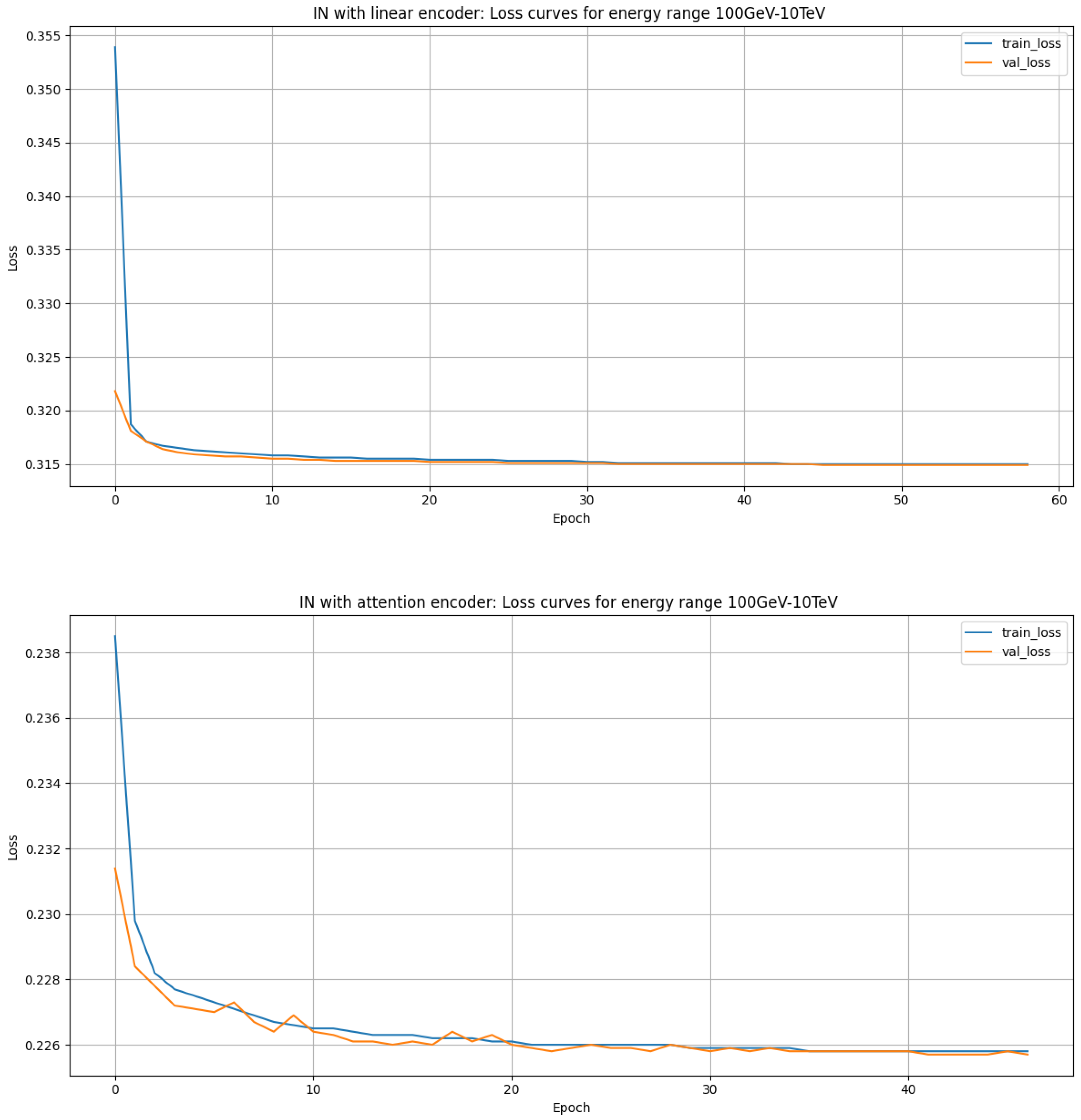 Learning curves for 100 GeV–10 TeV for interaction network with linear encoder (top) and interaction network with attention encoder (bottom).