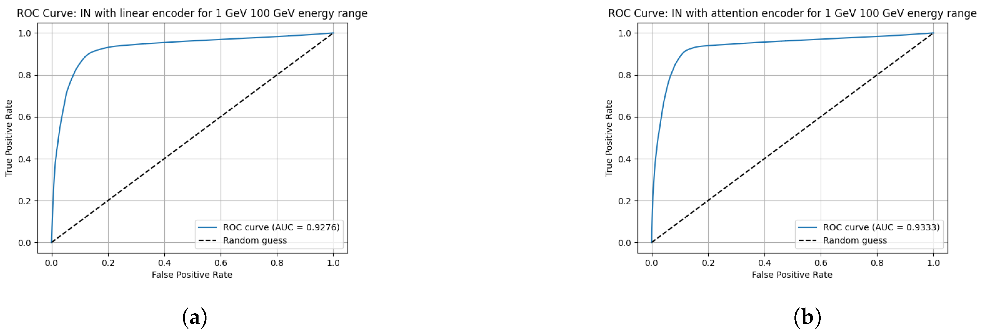 At low energies (1–100 GeV), both models achieve competitive and balanced performance, as illustrated by the ROC curves in the top panels of Figure 9. The linear encoder shows the highest recall (86.43%), demonstrating a stronger ability to correctly identify signal hits, while the attention encoder achieves higher precision (81.15%), reflecting a better suppression of false positives. These results suggest that the linear encoder favors sensitivity to signal clusters, whereas the attention mechanism is more effective at discriminating against backscattering.