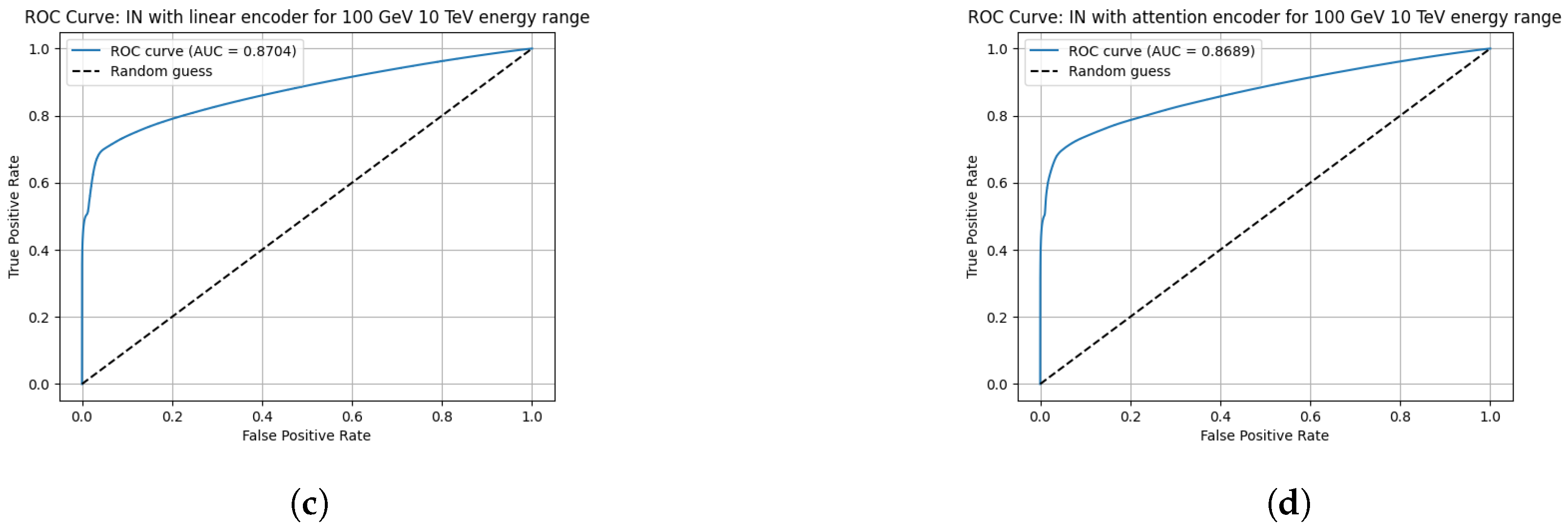 ROC curves for the two variants of the interaction network across the tested energy ranges. (a) ROC curve for the interaction network with the linear encoder in the 1 GeV–100 GeV energy range. (b) ROC curve for the interaction network with the attention encoder in the 1 GeV–100 GeV energy range. (c) ROC curve for the interaction network with the linear encoder in the 100 GeV–10 TeV energy range. (d) ROC curve for the interaction network with the attention encoder in the 100 GeV–10 TeV energy range.