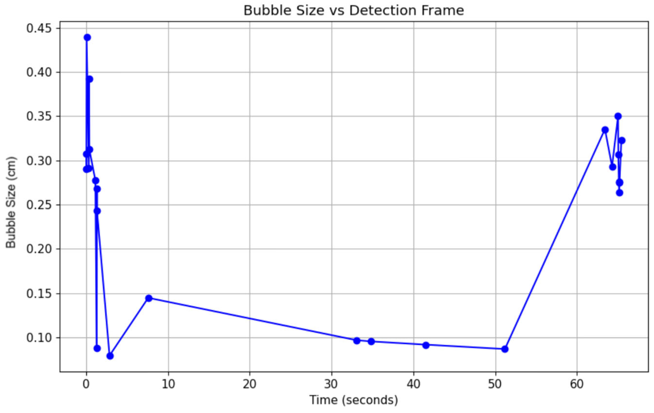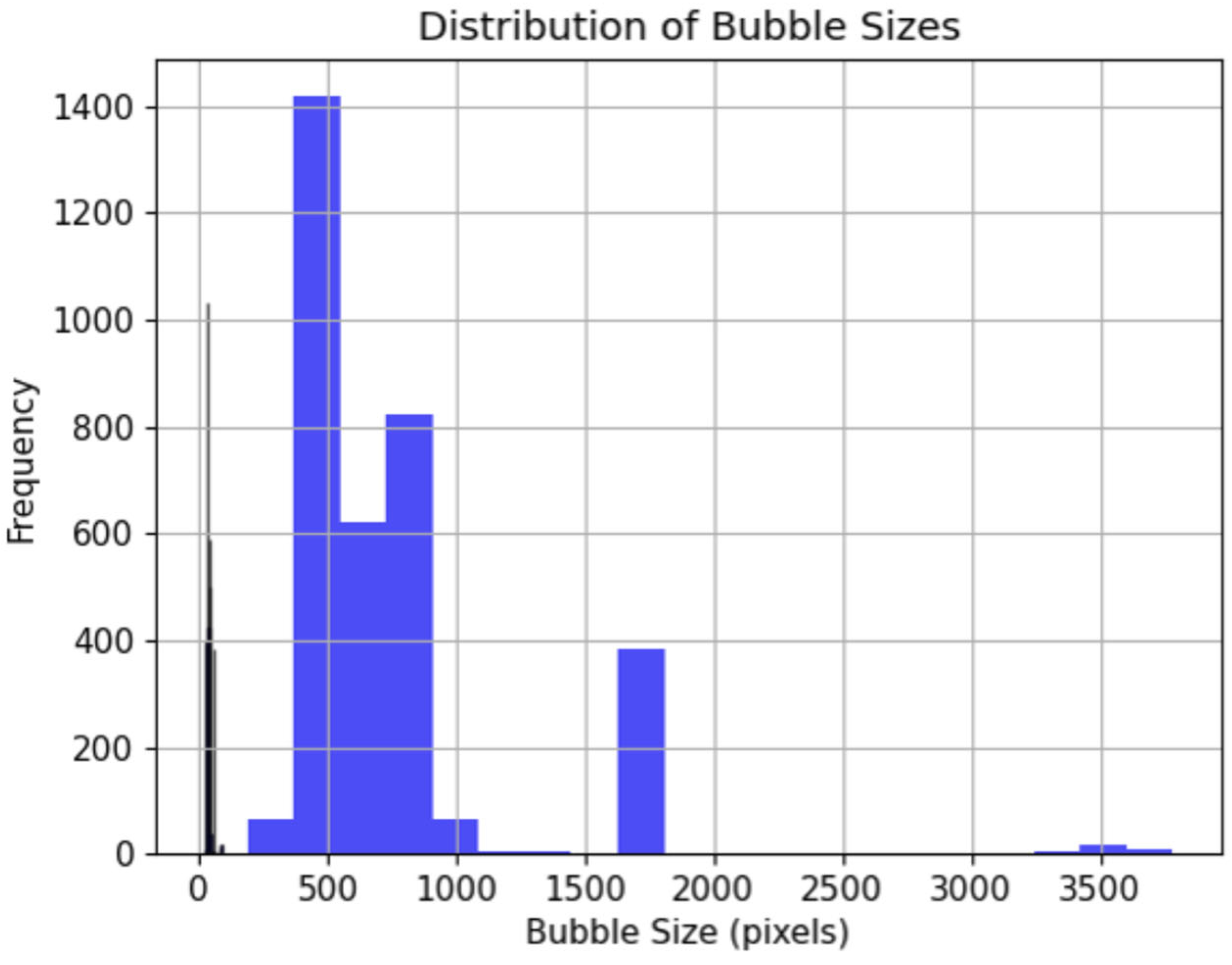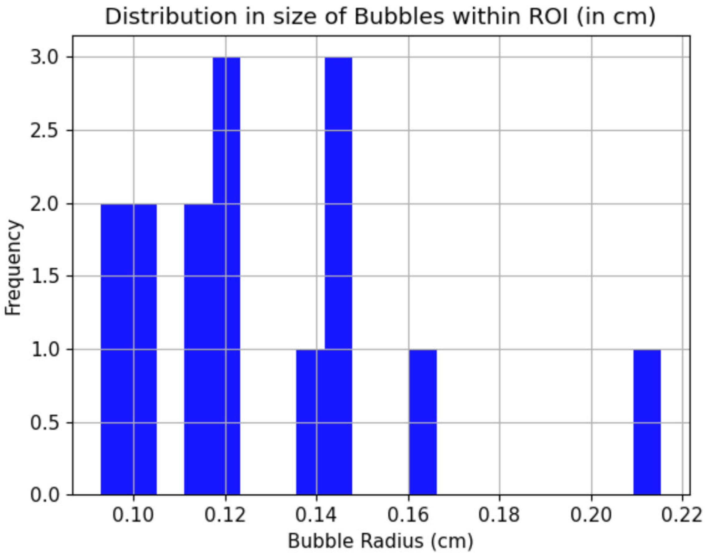 Additionally, bubble size measurement was updated from rectangular area approximation to a circular fit, and a conversion factor was applied to translate pixel measurements into physical dimensions. The resulting distribution is shown in
