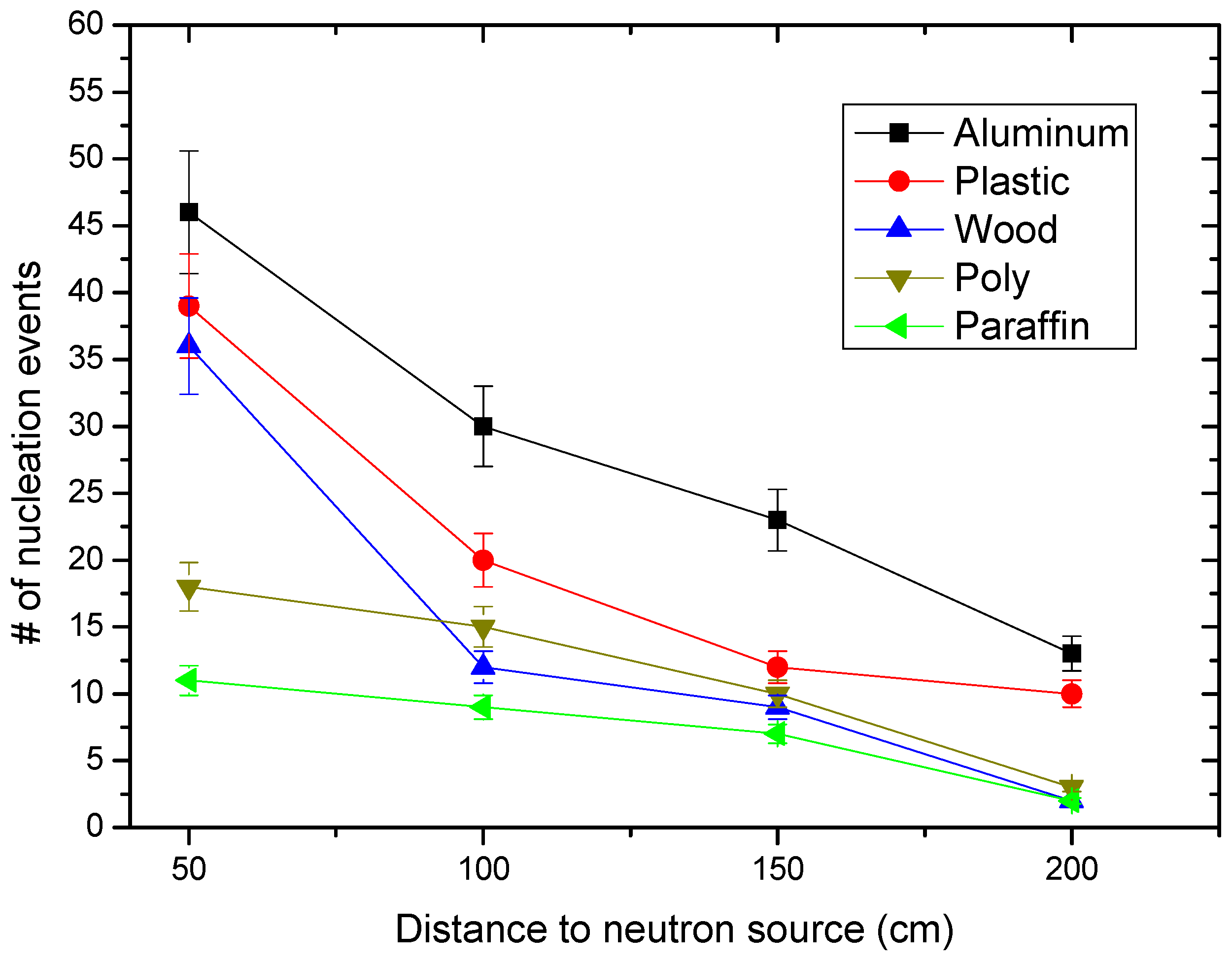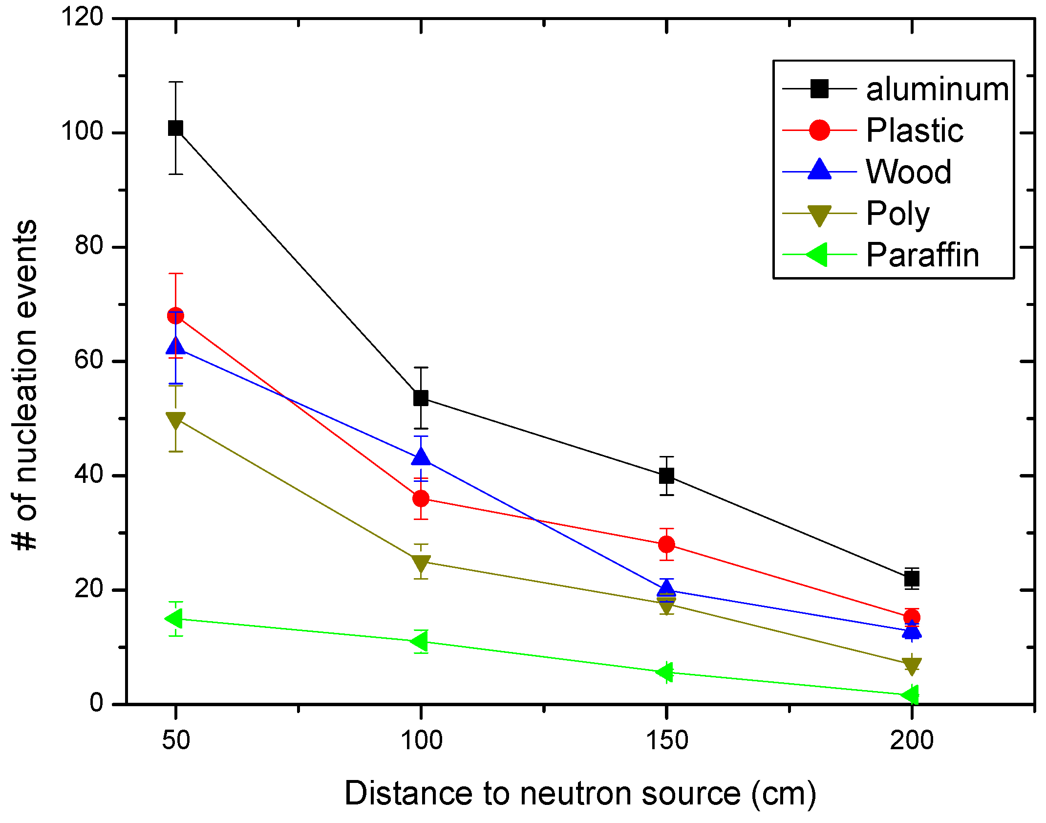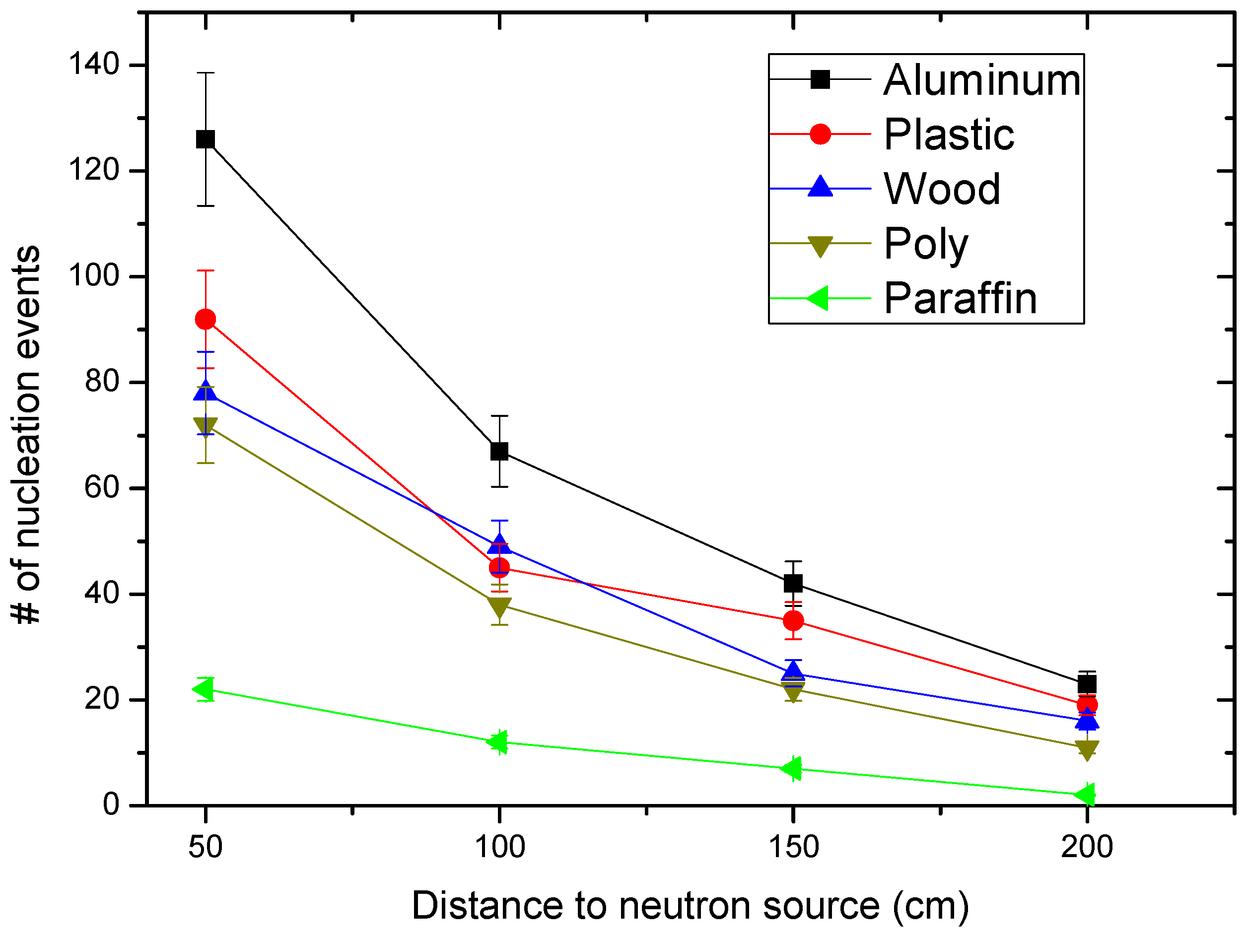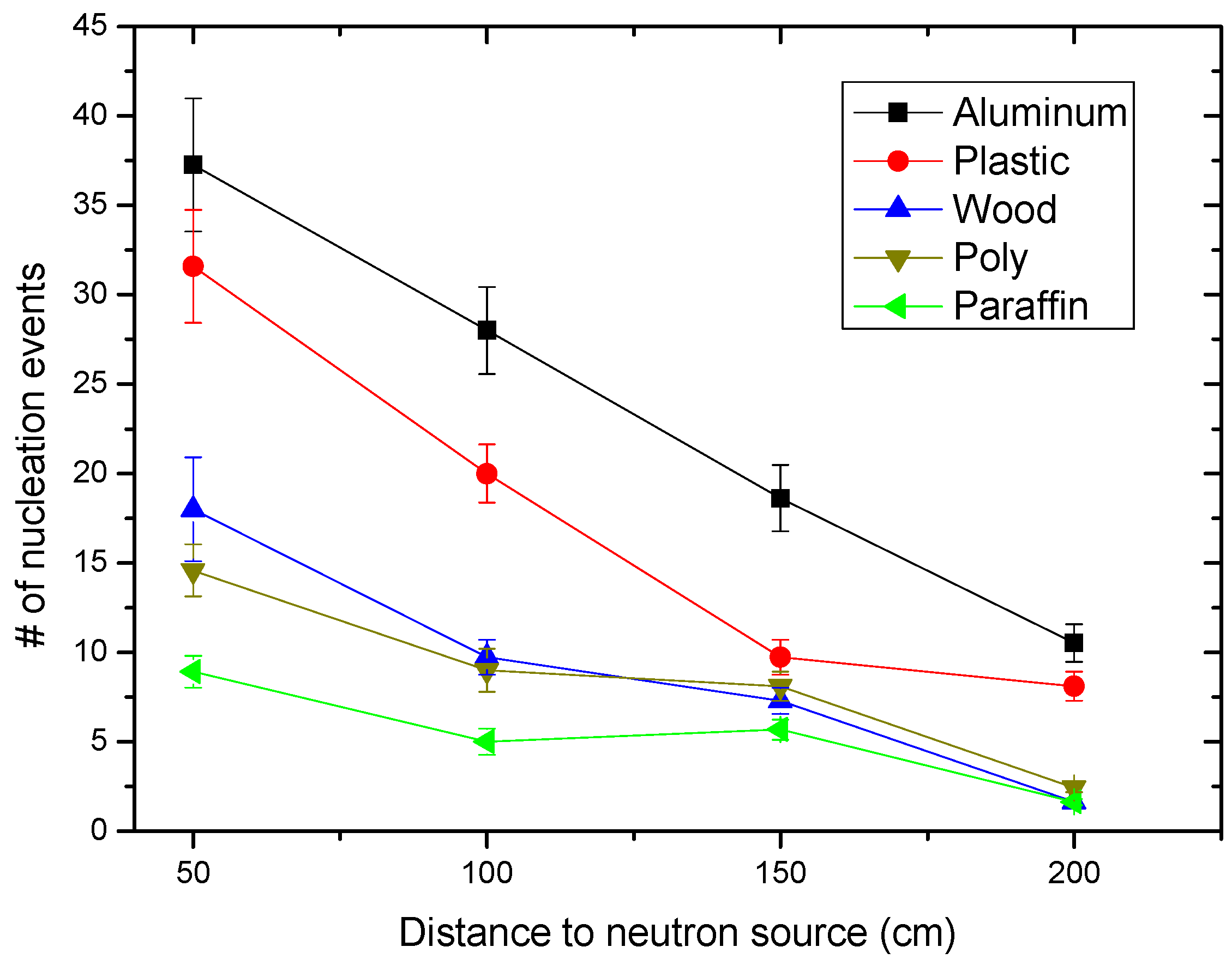 Figure 3 shows the acoustic count rate as a function of shielding material. As expected, aluminum produces the smallest reduction in neutron-induced nucleation, while wood and concrete produced noticeable decreases due to neutron moderation. Steel and lead produced the strongest attenuation.