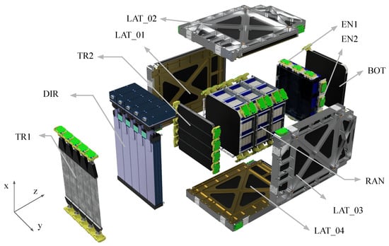 The HEPD-02 assembly onboard CSES-02 with its subdetectors: trigger planes (TR1 & TR2), silicon pixel direction detector (DIR), range detector (RAN) made of plastic scintillator, LYSO calorimeter (EN1 & EN2), Anticoincidence Detector (LAT_01 - LAT_04 & BOT).