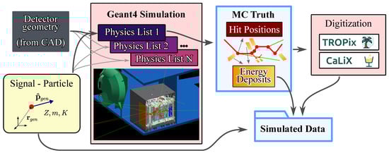 The overall Monte Carlo simulation workflow adopted for HEPD-02 is illustrated in Figure 2. The input to the simulation consists of the detector geometry, described in GDML format and imported directly from the detailed CAD model (see Section 2.1), and of the generated primary particle parameters, including position , direction , charge Z, mass m, and kinetic energy K. The Geant4-based simulation (central block in Figure 2) propagates the particle through the full detector model, accounting for the relevant physical interactions as defined by the selected physics list. The MC simulation of the HEPD-02 instrument has been developed using the Geant4 toolkit (version 10.6.1) [18]. The entire simulation pipeline is parallelized so that independent runs can be performed concurrently on the computing cluster, each using a different physics list configuration. The output of each simulation branch is a collection of Monte Carlo truth data, including the particle hit positions and the energy deposited in each sensitive volume at every simulation step.