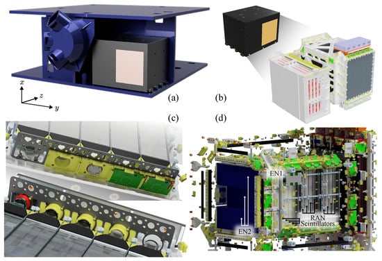 Overview of the HEPD-02 detector geometry implemented in the simulation. (a) Geometry placed in the world volume with the satellite body and star tracker. (b–d) Detailed CAD representation of the payload and subdetectors, including mechanical structures, PMTs, and electronic boards.