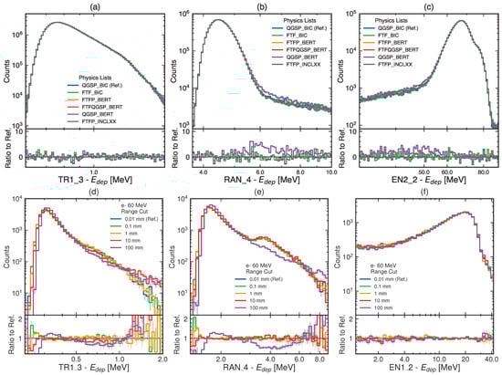 The relative performance of different physics lists is shown in Figure 4a–c, which reports energy-deposition distributions and ratios in three representative calorimeter units for 228 MeV protons. In this simulation, the beam is directed along the z-axis and focused on the center of the detector. The reference QGSP_BIC (blue) is compared against FTF_BIC (green), FTFP_BERT (orange), FTFQGSP_BERT (red), QGSP_BERT (purple), and FTFP_INCLXX (dark gray). At this energy, the ratio panels indicate overall agreement within statistical uncertainties.