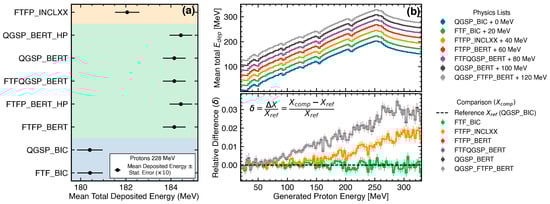 Figure 5 summarizes the dependence on incident energy. Also in these simulation runs, the proton beam is directed along the z-axis and focused on the center of the detector. Panel (b) shows that differences among families increase across 50–300 MeV. The dominant contributors are the intra-nuclear cascade models (BIC, BERT, and INCLXX) which govern hadronic interactions in the sub-GeV regime; the HP suffix denotes high-precision neutron extensions below 20 MeV based on evaluated data libraries [42]. At the highest energies (∼300 MeV), the mean deposited energy differs by about 3% between _BERT and _BIC, and by about 2% between _INCLXX and _BIC. These differences are statistically significant at 228 MeV as well, where panel (a) indicates offsets of roughly 4 MeV for _BERT vs. _BIC and 1.5 MeV for _INCLXX vs. _BIC. Such trends are consistent with known modeling variations in inelastic interactions and secondary-particle cascades. Below ≈70 MeV, the relative differences among the different hadronic physics lists become compatible within the statistical errors due to the predominant electromagnetic component of the interaction. No significant differences are observed between the “Fritiof Precompound” (FTFP_) and the “Quark Gluon String Precompound” (QGSP_) models, as these are typically invoked only when the particle energy exceeds 3 GeV and 12 GeV, respectively, which is not the case in this simulation.