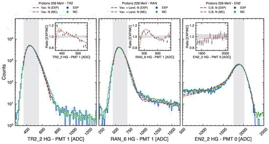 The first validation focuses on the calorimeter subsystem response, shown in Figure 9. The figure compares ADC signal distributions from three calorimeter elements: TR2 and RAN (plastic scintillators) and EN2 (LYSO), each read out by dedicated photomultiplier tubes. MC distributions are scaled to match the total number of events in the experimental data to allow direct shape comparison. Both data and MC error bars represent Poisson statistical uncertainties on the bin counts. The naming convention follows the pattern Subdetector_i HG - PMT j, where i indexes the scintillator element and j labels the PMT readout channel via the high-gain amplifier stage. The insets present the EXP/MC ratio, quantifying agreement by showing how well the MC prediction matches the measured distribution; gray bands in the insets indicate the statistical uncertainty band, derived from the combined errors of data and MC. All error bars represent statistical uncertainties only.