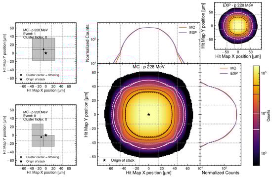 The resulting 2D hit maps are shown for MC simulation (central panel) and experimental data (top-right panel). To facilitate direct visual comparison, iso-density contour lines at matched levels (from the logarithmic color scale) are drawn on both maps: solid contours represent MC while dashed contours represent experimental data. The one-dimensional projections along the X and Y axes (top and right panels) show the marginal distributions obtained by integrating the 2D maps.