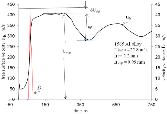 Free surface velocity profile, ufs(t), and velocity variance profile, D(t), for 1565 aluminum alloy target of 2.2 mm thickness loaded at the impact velocity 422.8 m/s.