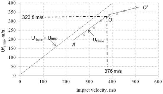 Dependence of the maximum free surface velocity, Ufs max, on the impact velocity for 38CrNi3MoV steel. Dotted line at 450 corresponds to equality of the free surface velocity to impact velocity under symmetrical collision. Transition to structure-unstable state occurs at the impact velocity of 376 m/s.