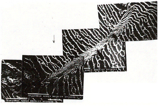 In Figure 4, a transition of shear band into rotation cell for a shock-loaded VT14 titanium alloy is presented.